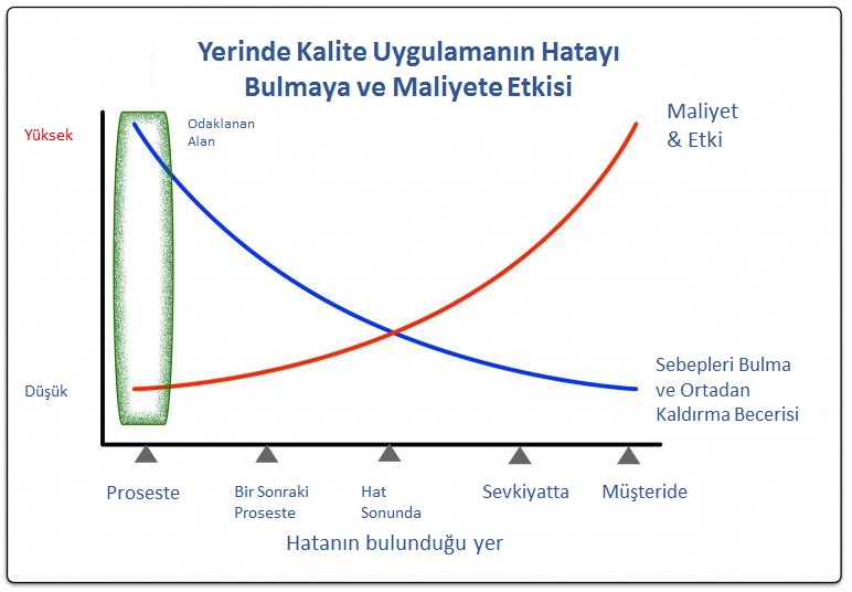 Bunları aşağıdaki şekilde, biraz daha görsel ve sayısal olarak ifade edebilirsek Yalın araçları kullanmaya karar veren firmaların neden bu yolu seçtiğini anlamak daha kolay olabilir. Örneğin “Yerinde Kalite” uygulamak ve uygulamamak arasında nasıl bir fark var? Aşağıdaki grafikte de görebileceğimiz gibi “Yerinde Kalite” uyguladığımızda, maliyetlerimiz düşüyor, hatayı bulma ve ortadan kaldırma becerimiz artıyor.